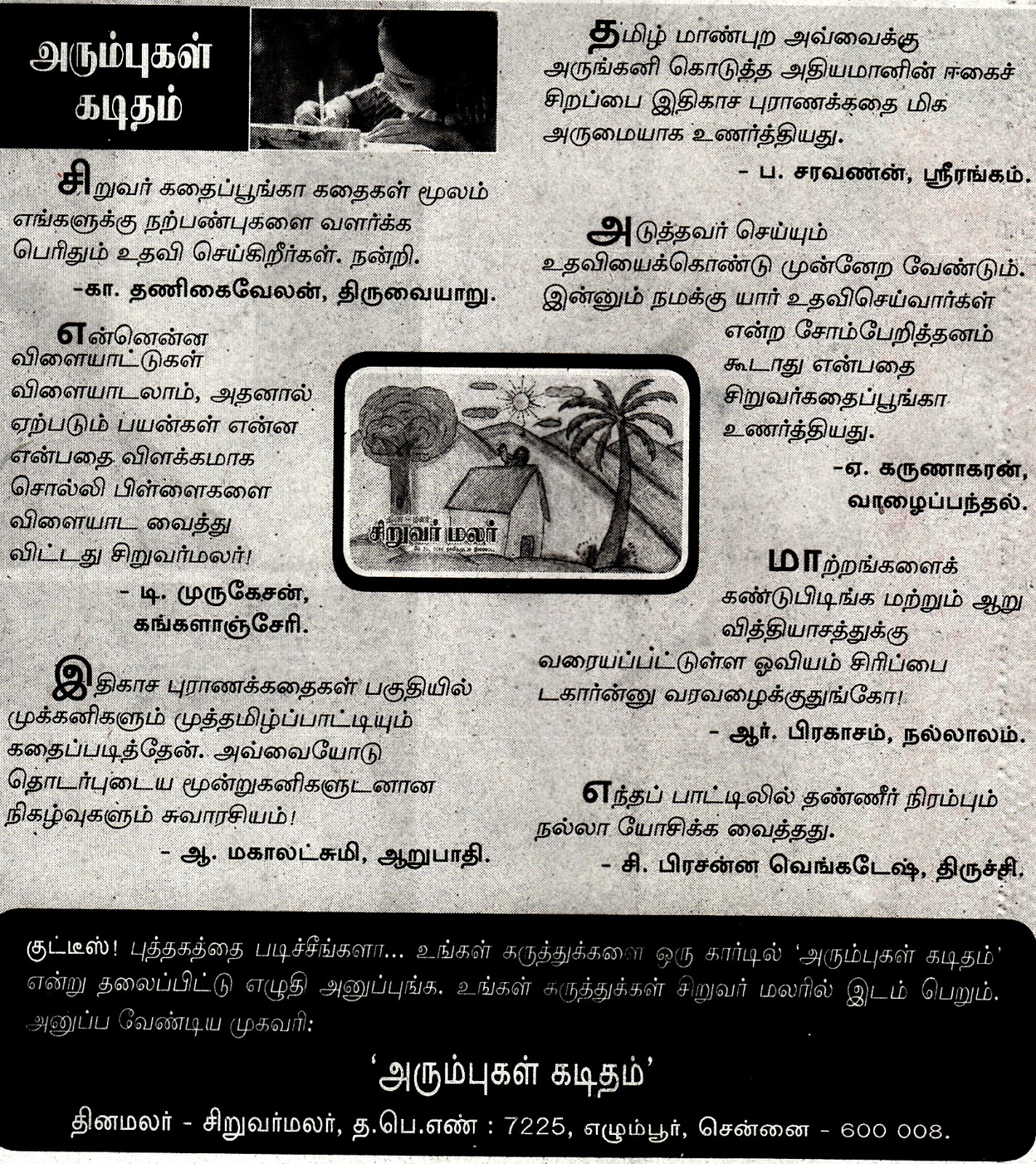தினமலர் சிறுவர் மலரில் இதுவரை 50 வாசகர் கடிதங்கள் வரை இதிகாச புராணக்கதைகளைப் பாராட்டி வெளியாகி உள்ளன. படித்ததோடு நின்றுவிடாமல் சிரத்தை எடுத்து அதைப் பாராட்டிக் கடிதம் எழுதித் தெரிவித்த வாசகர்களின் அன்புக்கு நன்றி.