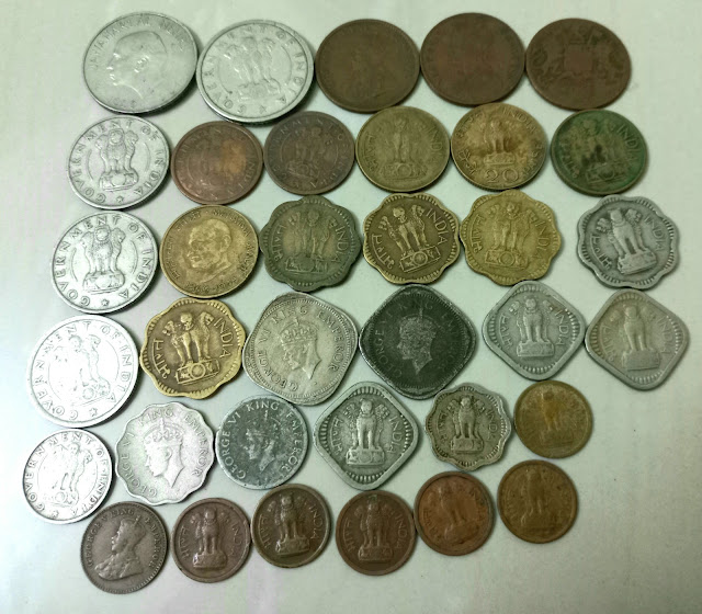 197, 80 களில் வந்த தாமரைப்பூ போட்ட பித்தளை 20 பைசா , முற்றிய நெற்கதிர், காந்திஜி, மான், தேசிய விலங்கு சிங்கம் ஆகியன பொரித்த நாணயங்கள். பத்துப் பைசாக்களும், ஐந்து பைசாக்களும் ஒரு நயா பைசாக்களும் கூட உள்ளன.எட்டணா - 1/2 அரை ரூபாய் , காலணா - 1/4 கால் ரூபாய் ஆகியவை 1950 களின் வெளியீடு.